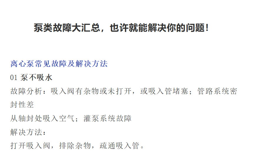 离心泵常见故障及解决方法 01泵不吸水 故障分析:吸入阀有杂物或未打开,或吸入管堵塞;管路系统密封性差 从轴封处吸入空气;灌泵系统故障 解决方法: 打开吸入阀,排除杂物,疏通吸入管。 检察管路,尤其分段试压连接法兰处,堵漏。 更换轴封,压紧填料密封 检查及维修灌泵系统