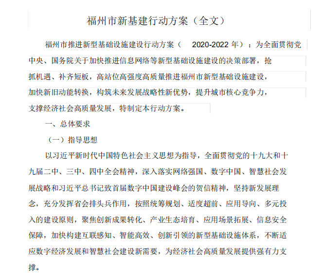 福州市推进新型基础设施建设行动方案( 2020-2022 年) :为全面贯彻党 中央、国务院关于加快推进信息网络等新型基础设施建设的决策部署,抢 抓机遇、补齐短板,高站位高强度高质量推进福州市新型基础设施建设, 加快新旧动能转换,构筑未来发展战略性新优势,提升城市核心竞争力, 支撑经济社会高质量发展,特制定本行动方案。