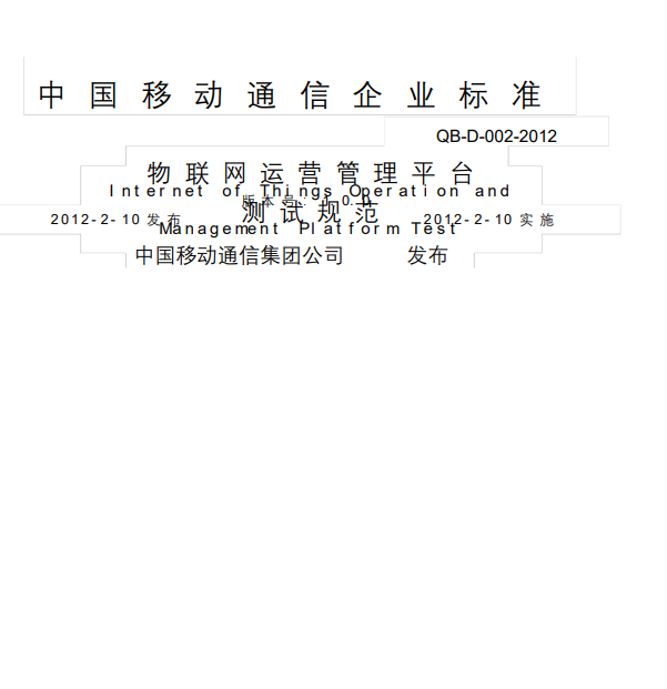 本标准是对中国移动物联网运营管理平台需要实现的功能测试的参考性技术文件。本标准规定了中国移动物联网运营管理平台功能、门户、系统管理、接口功能、性能及稳定性、安全性等方面的测试要求,并对测试步骤和正确的测试结果的作了详细的规定。