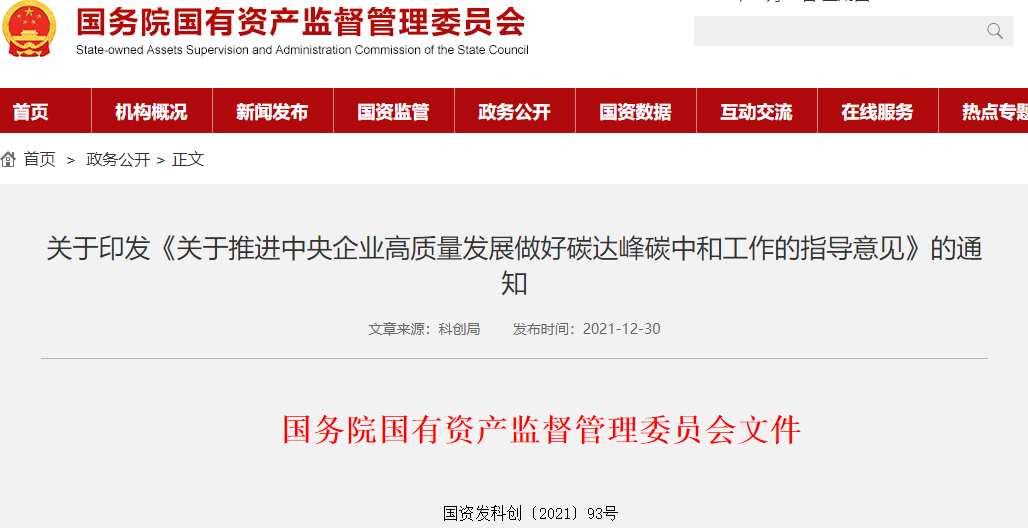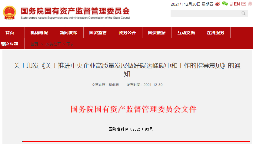 《关于推进中央企业高质量发展做好碳达峰碳中和工作的指导意见》
