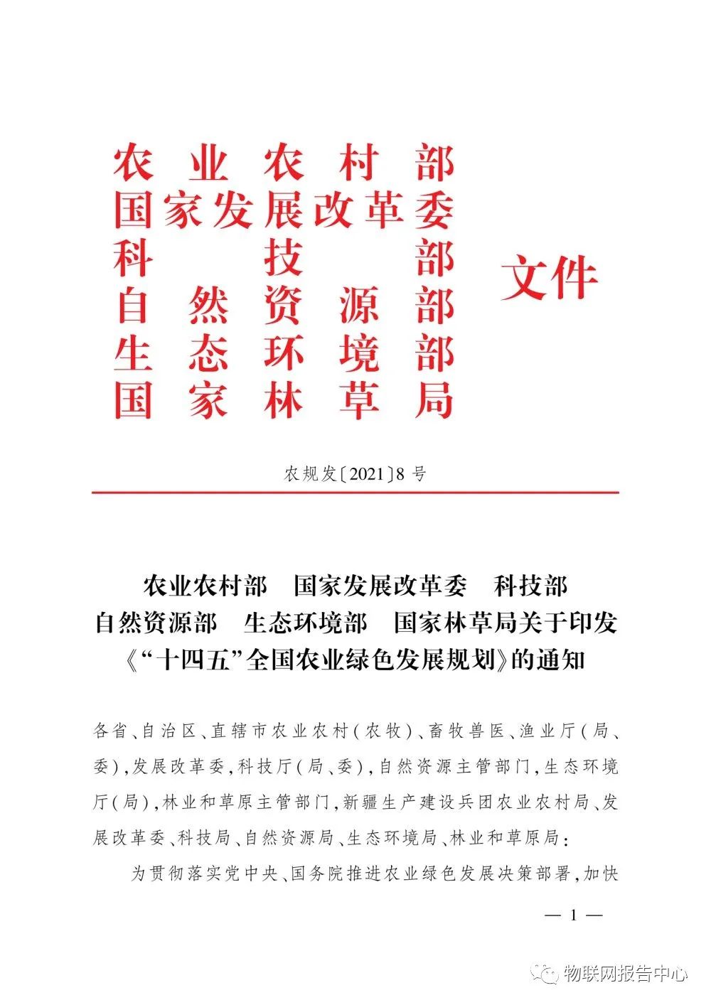 为贯彻落实党中央、国务院推进农业绿色发展决策部署,加快农业全面绿色转型,持续改善农村生态环境,农业农村部、国家发展改革委、科技部、自然资源部、生态环境部、国家林草局制定了《“十四五”全国农业绿色发展规划》(以下简称《规划》),现印发你们,请结合实际认真贯彻执行。