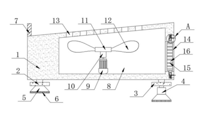 本实用新型公开了一种软件技术开发用笔记本支撑底座,包括底座主体,所述底座主体的下表面设置有支撑机构,所述底座主体的中部开设有散热腔,所述散热腔的内部设置有散热机构,所述底座主体上表面的中部贯穿设有散热孔,所述底座主体的右侧面贯穿设有安装孔。本实用新型通过设置伺服电机、转动杆、转动块、扇叶和散热孔,使得伺服电机通过转动杆带动转动块转动,从而带动扇叶通过散热孔对底座主体上表面的笔记本底部进行散热,有效的防止了笔记本因温度过高造成损坏,还通过设置安装孔、活动板和通风孔,使得活动板可以通过通风孔进行散热的同时对灰尘进行阻隔,防止灰尘进入散热腔内部,从而使得扇叶的散热效果更好。