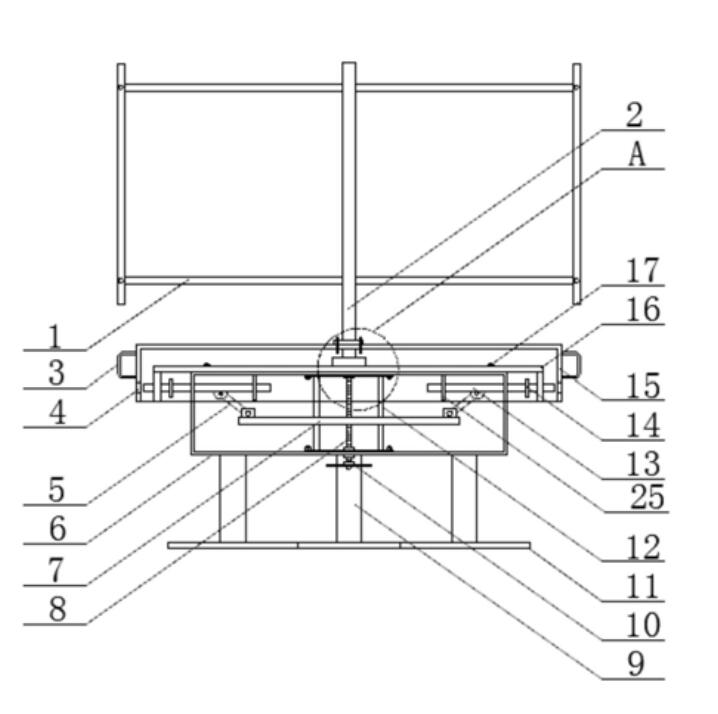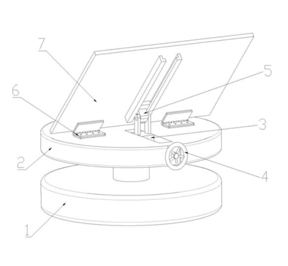 本实用新型公开了一种软件技术开发教学用旋调展示幕,包括圆台,所述圆台内设有空腔,所述空腔内设有调节装置,所述圆台的上端可拆卸连接有横板,所述横板的下端两侧均固定有连接板,所述调节装置上设有两个移动杆,所述空腔内的顶部固定有两个竖板,两个移动杆的一端分别贯穿两个竖板的侧壁并延伸至竖板的一侧,所述连接板上设有限位孔。本实用新型解决了不方便根据使用者的需求调节展示角度的问题,同时也解决了展示屏幕稳定性差的问题,避免了人工搬运调节角度影响教学效率的情况发生,提高了展示屏的稳定性,同时还降低了教学人员的劳动强度,提高了教学效率,保证了教学质量。