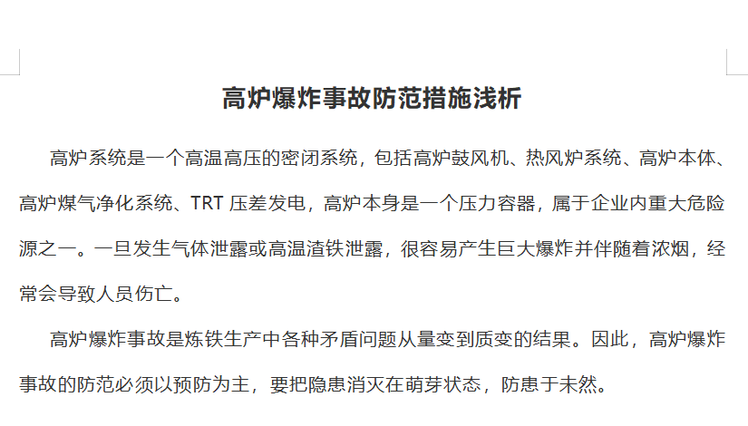 高炉系统是一个高温高压的密闭系统,包括高炉鼓风机、热风炉系统、高炉本体、高炉煤气净化系统、TRT压差发电,高炉本身是一个压力容器,属于企业内重大危险源之一。一旦发生气体泄露或高温渣铁泄露,很容易产生巨大爆炸并伴随着浓烟,经常会导致人员伤亡。 高炉爆炸事故是炼铁生产中各种矛盾问题从量变到质变的结果。因此,高炉爆炸事故的防范必须以预防为主,要把隐患消灭在萌芽状态,防患于未然。