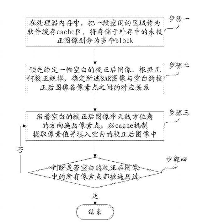 本发明提出一种软件cache技术用于SAR图像几何校正的方法,具体步骤为:在处理器内存中,把一段空闲的区域作为软件cache区,将未校正SAR图像存储于多个block中,每个block内存储的数据的地址连续;根据几何校正规律,确定校正前SAR图像与预先给定的空白的校正后图像各像素点之间的对应关系;步骤三、沿着天线方位角方向斜线遍历空白的校正后图像上的像素点,以cache机制提取像素值并填入空白的校正后图像中,直至所有的空白的未校正图像上的像素点都已遍历。本发明突破了处理器访问外部存储器的效率低下造成的瓶颈,提高了数据交互效率。
