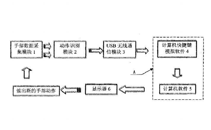 本实用新型属于计算机软件控制技术领域,具体是一种应用图形软件技术实现的操控系统。本实用新型包括手部数据采集模块、动作识别模块、USB无线通信模块和计算机,其中手部数据采集模块包括加速度计传感器、压力传感器和麦克风,所述的动作识别模块的输入端与速度计传感器和压力传感器之,间为有线连接。所述的无线通信方式采用Zi gBee协议或Bluetooth协议。本实用新型的体积小,使用方便,操作方式简单。另外,本实用新型实用性强,生产成本不高,结构简单,适合在相关技术领域推广使用。