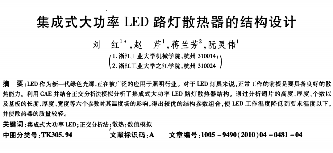 LED作为新一代绿色光源,正在被广泛的应用于照明行业。对于LED灯具来说,正常工作的前提是要具备良好的散热能力。利用CAE并结合正交分析法模拟分析了集成式大功率LED路灯散热器结构。通过分析翅片的高度、厚度、个数以及基板的长度、厚度、宽度等六个参数对其温度场的影响,得出较优的结构参数组合,使LED.工作温度降低到要求温度以下,并使散热器的质量较轻。