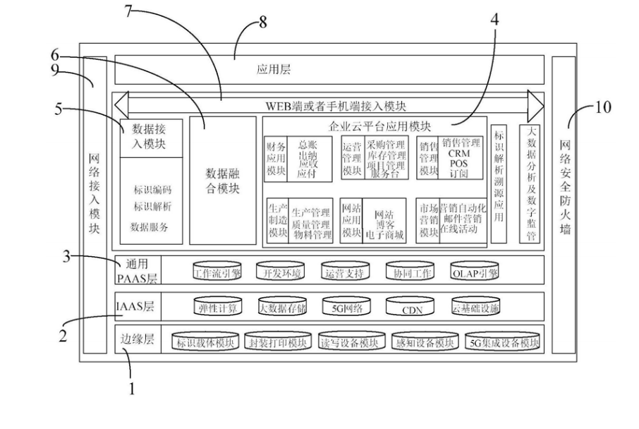 一种基于工业互联网标识解析的大数据决 策分析系统,包括前端硬件设备和工业云服务平 台,前端硬件设备包括信息采集终端,信息采集 终端将产品或者设备信息通过互联网实施上传 至工业云服务平台;工业云服务平台包括边缘 层、IAAS层、通用PAAS层、企业云平台应用模块、 数据接入模块、数据融合模块、WEB端或者手机端 接入模块、应用层、网络接入模块和网络安全防 火墙。本发明还提供一种基于工业互联网标识解 析的大数据决策分析方法。本发明在边缘层主要 完成了产品赋码和标识接入工作,结合5G网络技 术,快速高效的将标识数据纳入整个工业互联网 标识解析体系中,为基于标识解析大数据决策分 析应用服务平台提供基础数据支撑。