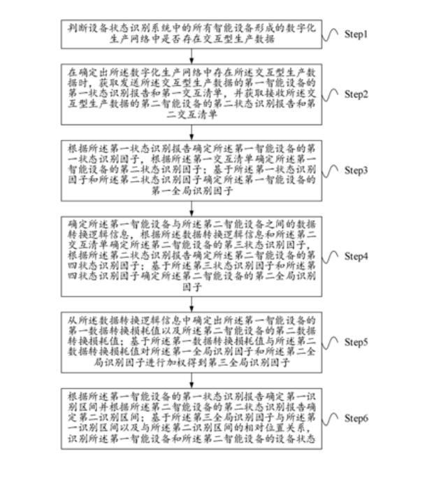 本申请是关于应用于工业互联网的设备状态识别方法及识别终端。在应用本申请方案时,全局识别因子是基于状态识别报告和交互清单确定的,而状态识别报告和交互清单是可以通过交互型生产数据对应的第一智能设备和第二智能设备来确定的,在根据全局识别因子对第一智能设备和第二智能设备进行识别时,没有直接对交互型生产数据进行特征分析和处理。这样,在交互型生产数据过大时,能够通过对状态识别报告和交互清单进行分析,以实现对交互型生产数据对应的不同智能设备的状态的间接识别,能够有效控制时间成本。在一些时效性要求较为严格的工况下,通过上述方法能够快速、准确地识别出智能设备的状态。