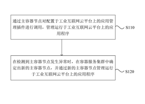 本发明实施例公开了一种工业互联网云平 台的应用管理方法、装置、设备及介质,该方法包 括:通过主容器节点对配置于工业互联网云平台 上的应用管理插件进行调用,管理运行于工业互 联网云平台上的应用程序;在检测到主容器节点 发生异常时,在容器服务集群中确定出新的主容 器节点,并通过新的主容器节点管理运行于工业 互联网云平台上的应用程序。实现了对工业互联 网云平台上的应用程序的管理,并且可以使容器 服务集群一直服务,解决了容器服务集群中某一 容器节点出现故障,而使整个容器服务集群停止 服务的问题。