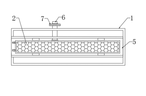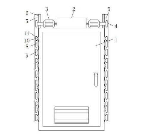 本发明公开了一种基于工业互联网协议架 构的通信及信息储存系统,包括主机储存箱本 体、步进电机本体、弹簧伸缩杆和通信信息储存 主机,所述主机储存箱本体顶部固定有顶箱和步 进电机本体,所述内螺纹套筒与水平螺纹杆相互 连接,且水平螺纹杆末端焊接固定有侧限位板所 述底块与工作槽贴合,且工作槽开设在隔板上, 并且隔板上设置有通信信息储存主机,同时通信 信息储存主机边侧开设有卡槽。该基于工业互联 网协议架构的通信及信息储存系统,采用新型的 结构设计,使得本装置中的定位散热设备可以由 PLC进行自动控制,PLC控制步进电机工作就能实 现对多个通信信息储存主机的同时定位固定,且 定位方向包括垂直方向和水平方向,稳定性更 强,同时散热性能也更加。