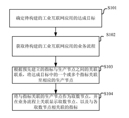 本申请实施例中提供了一种工业互联网的 构建方法、装置及计算机存储介质,方法包括:确 定待构建的工业互联网应用的达成目标,达成目 标包括一个或多个指标和各指标对应的目标值; 获取待构建的工业互联网应用的业务流程,业务 流程包括多个生产节点,以及多个生产节点之间 的业务关系;根据预先建立的指标与生产节点之 间的关联联系,将达成目标中的一个或多个指标 关联至相应的生产节点;将与指标关联的生产节 点作为取数节点,并在业务流程上关联显示取数 节点、以及与各取数节点相关联的指标。采用本 申请中的方案,能够提升工业互联网实施的效 率。