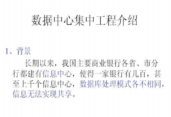 长期以来,我国主要商业银行各省、市分行都建有信息中心,使得一家银行有几百,甚至上千个信息中心,数据库处理模式各不相同,信息无法实现共享。