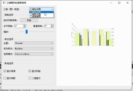 三维柱状图三维散点图三维曲面图设置视角水平视角垂直视角设置主题样式设置系列样式二维显示槽函数的添加using namespace QtDataVisualization;datavisualizationQ3DBars QBar3DSeries QBarDataArrayQ3DScatter QScatter3DSeries QScatterDataArrayQ3DSurface QSurface3DSeries QSurfaceDataArray......