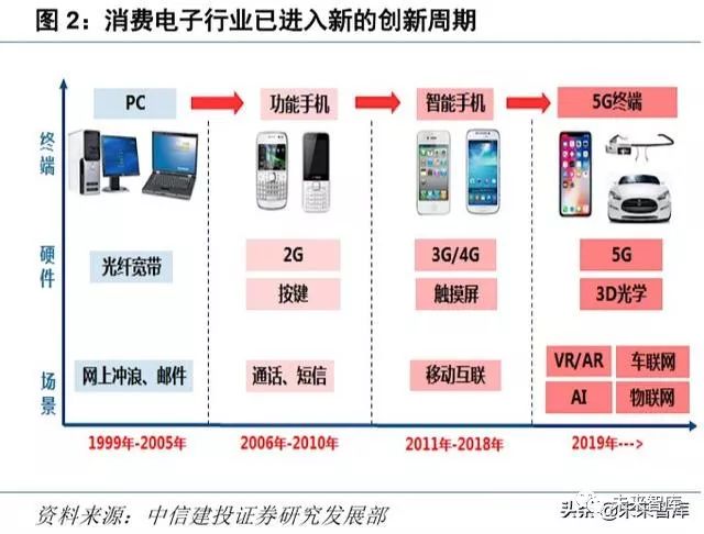 从产品以及应用场景来看,iPhone 11 在材料、设计以及交互方式上领先创新(包括高频材料、3D 光学等), 本质上是 4G 向 5G 过渡期的提前探索。预计 2020 年安卓阵营将继续推出多款 5G 手机,成为 5G 终端的起点, 而苹果则将在 2020 年推出 5G 版本的 iPhone,且 VR/AR、智能汽车等新型终端有望放量,带动 5G 终端渗透率 大幅提升。而带有创新配置的终端保有量不断积累,也将使 AI、VR/AR 等新兴应用场景具备更大的推广可能, 有望再次看到应用与硬件之间的相互促进和良性循环。