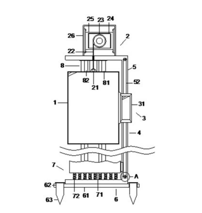 本实用新型提供一种智能楼宇消防安全远程监控设备,属于消防监控技术领域,该智能楼宇消防安全远程监控设备包括防火板,防火板的上端固定连接有连接管,防火板的下端固定连接有喷水管,连接管与喷水管相贯通,喷水管的圆周表面固定连接有保护圈,保护圈的圆周表面转动连接有齿轮,齿轮的下端固定连接有两个固定杆,两个固定杆之间通过转轴转动连接有摄像头,摄像头与外部电源连接,防火板的下端固定连接有电机,电机与外部电源连接,电机的输出端固定连接有蜗杆,蜗杆的下端与齿轮的上端啮合连接,旨在解决现有技术中的部分消防监控设备不能够全面的观察到火灾的情况,使灭火造成一定的阻碍,浪费大量的时间,造成不必要的损失的问题。