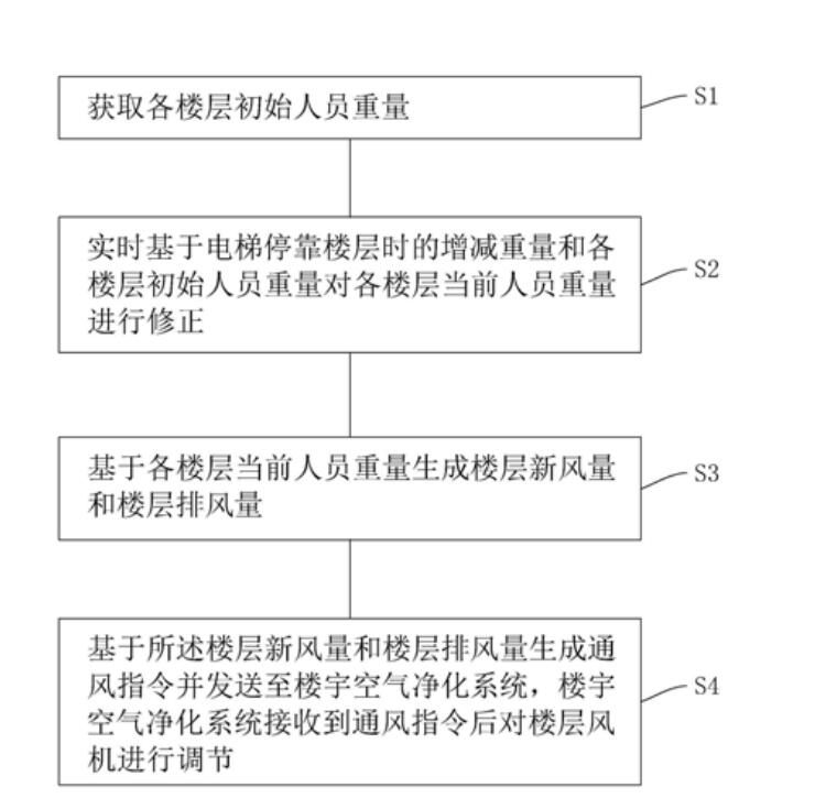 本申请涉及建筑节能领域,尤其是涉及一种智能化建筑通风节能调控方法、系统以及存储介质,智能化建筑通风节能调控方法包括获取各楼层初始人员重量;实时基于电梯停靠楼层时的增减重量和各楼层初始人员重量对各楼层当前人员重量进行修正;基于各楼层当前人员重量生成楼层新风量和楼层排风量;基于所述楼层新风量和楼层排风量生成通风指令并发送至楼宇空气净化系统,楼宇空气净化系统接收到通风指令后对楼层风机进行调节。本申请具有更合理地控制楼宇空气净化系统的运行能耗,提升整个空气质量运营水平的优点。