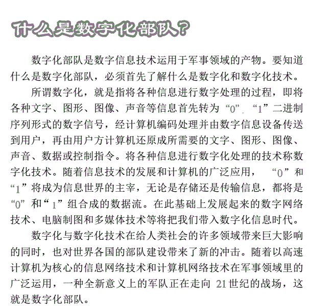 数字化部队,是数字信息技术运用于军事领域的产物,要知道什么是数字化部队,必须首先了解什么是数字化和数字化技术。