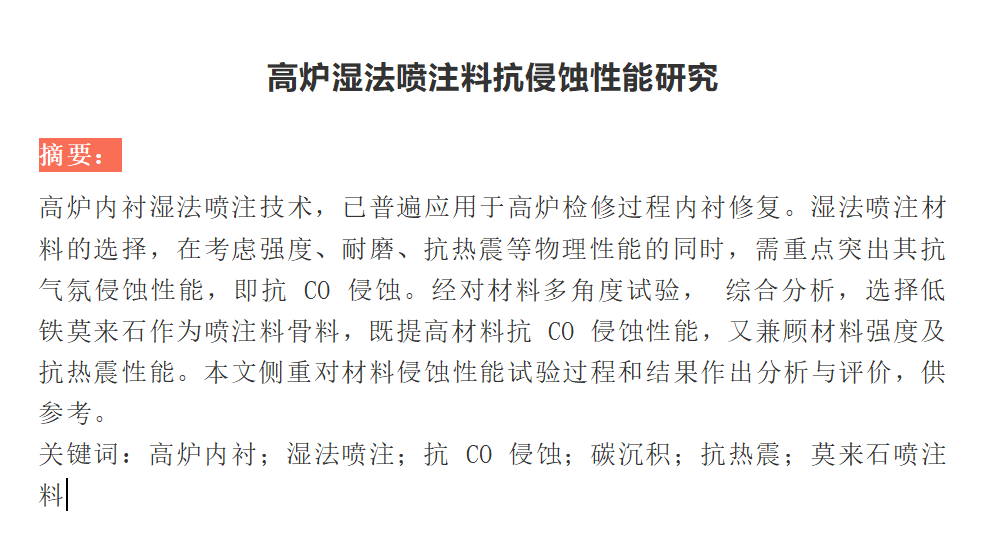 高炉内衬湿法喷注技术,已普遍应用于高炉检修过程内衬修复。湿法喷注材料的选择,在考虑强度、耐磨、抗热震等物理性能的同时,需重点突出其抗气氛侵蚀性能,即抗 CO 侵蚀。经对材料多角度试验, 综合分析,选择低铁莫来石作为喷注料骨料,既提高材料抗 CO 侵蚀性能,又兼顾材料强度及抗热震性能。本文侧重对材料侵蚀性能试验过程和结果作出分析与评价,供参考。