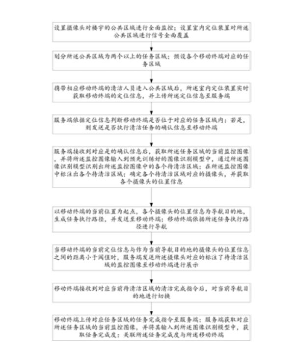 本发明提供一种楼宇物业智能管理方法及其系统,方法包括:实时获取移动终端的定位信息;服务端依据定位信息判定移动终端位于对应的任务区域内,并接收到启动任务的确认信息后,获取任务区域的当前监控图像,并输入到图像识别模型识别出各个待清洁区域;获取各个待清洁区域对应的摄像头的位置信息,生成任务执行路径,移动终端进行导航;当移动终端到达当前导航目的地,服务端发送对应的标注有待清洁区域的监控图像至移动终端进行展示;移动终端接收到清洁完成指令后,切换至下一个导航目的地;服务端依据任务完成指令获取任务完成度;关联任务完成度与所述移动终端。本发明能够维持良好的物业清洁度,且在缩减人力成本的同时又提高管控效果。
