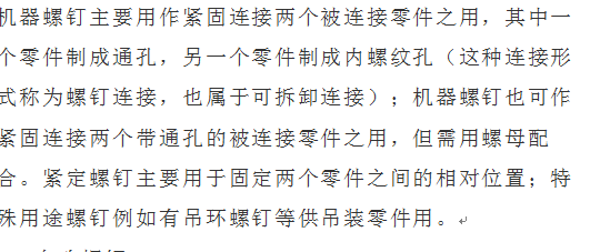 机器螺钉主要用作紧固连接两个被连接零件之用,其中一个零件制成通孔,另一个零件制成内螺纹孔(这种连接形式称为螺钉连接,也属于可拆卸连接);机器螺钉也可作紧固连接两个带通孔的被连接零件之用,但需用螺母配合。紧定螺钉主要用于固定两个零件之间的相对位置;特殊用途螺钉例如有吊环螺钉等供吊装零件用