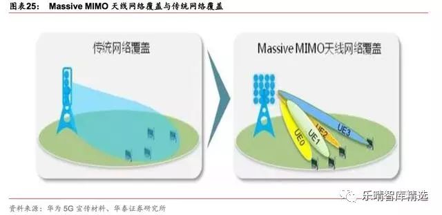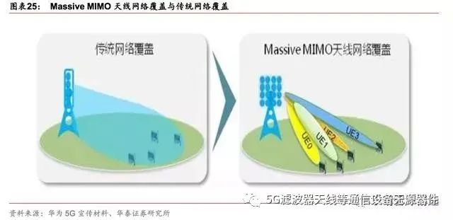 MassiveMIMO,即大规模MIMO(Multiple-inputMultiple-output,多输入多输出)技术,旨在通过更多的天线大幅提高网络容量和信号质量,原理上可类比高速公路拓展马路道数来提高车流量。 采用MassiveMIMO的5G基站不但可以通过复用更多的无线信号流提升网络容量,还可通过波束赋形大幅提升网络覆盖能力。