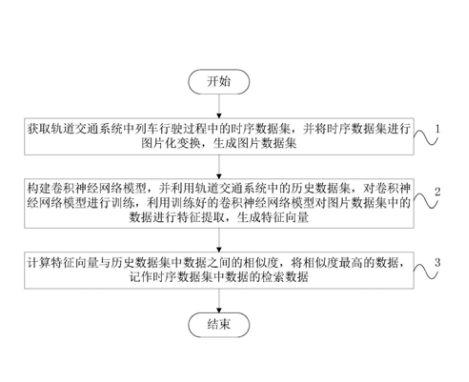 本申请公开了一种基于轨道交通工业互联 网的工业时序数据检索方法,该方法包括:步骤 1,获取轨道交通系统中列车行驶过程中的时序 数据集,并将时序数据集进行图片化变换,生成 图片数据集;步骤2,构建卷积神经网络模型,并 利用轨道交通系统中的历史数据集,对卷积神经 网络模型进行训练,利用训练好的卷积神经网络 模型对图片数据集中的数据进行特征提取,生成 特征向量;步骤3,计算特征向量与历史数据集中 数据之间的相似度,将相似度最高的数据,记作 时序数据集中数据的检索数据。通过本申请中的 技术方案,对轨道交通系统中的时序数据进行图 片化,使得可以分析的数据覆盖面更全,提高轨 道交通时序数据检索的有效性和准确性。