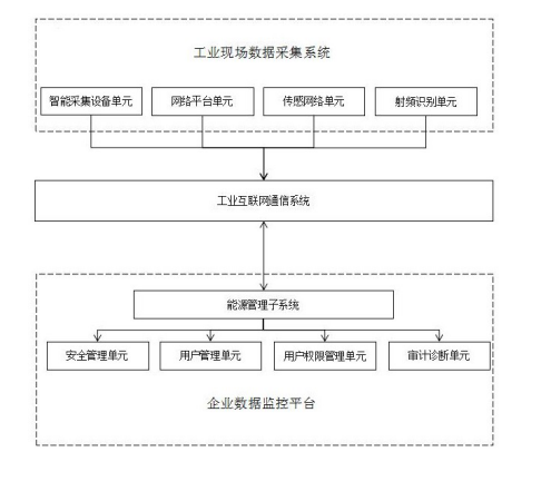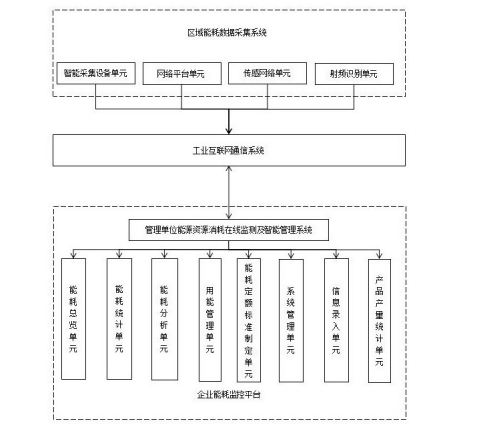 本发明公开了一种基于工业互联网的能耗 监控及分析系统,通过设置区域能耗数据采集系 统、企业能耗监控平台,利用区域能耗数据采集 系统采集生产设备的生产数据和能耗数据,对采 集的信息进行统一化、标准化处理并将数据传输 至企业能耗监控平台;并由企业能耗监控平台包 括管理单位能源资源消耗在线监测及智能管理 系统,用于存储能耗数据,并与该地区工业企业 能耗定额值、能耗指标值及能耗标杆值进行比 较。旨在解决现有技术中存在的能源管理中电力 能源数据处理方法的建设成本高、系统灵活性弱 以及共享性差的问题较为普遍 ,能源数据不能及 时、直观的发送至能源管理负责人,特别在企业 生产的能耗监控上,无法做到及时响应的技术问 题。
