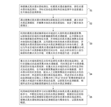 本发明涉及一种循环优化的高光谱大数据 水质全天候动态监测方法,步骤S1、建立全天候 动态监测系统;步骤S2、建立初步水质反演模型, 解算水体水质浓度指标;步骤S3、通过与作业区 域的机载高光谱成像系统获取的水体影像叠加 分析,标识出水质参数浓度的空间分布,分析排 污口及污染超标重点关注水域,对重点关注水域 进行进一步监测:步骤S4、根据实时监测数据搭 建特定点位的水质反演模型;步骤S5、用神经网 络深度学习对长期采集的水体高光谱大数据进 行训练学习,定期对原位光谱水质在线监测仪、 便携式高光谱检测设备的反演模型精准优化。全 天候长期动态监测水体环境信息,神经网络学习 手段对水体高光谱数据进行处理,利用深度学习 优化水质反演模型。