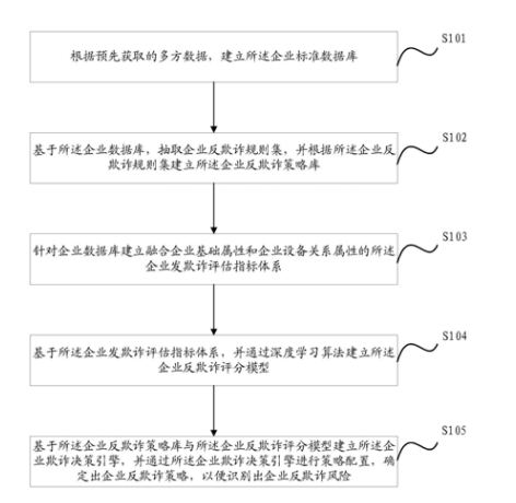 本说明书实施例公开了一种基于大数据的 信贷反欺诈识别方法、装置、设备及介质用以解 决现有的反欺诈手段,对新出现的、隐藏式的欺 诈手段拦截效果不佳的问题。方法包括:根据预 先获取的多方数据,建立述企业数据库;基于企 业数据库,抽取企业反欺诈规则集,并根据企业 反欺诈规则集建立企业反欺诈策略库;针对企业 数据库建立融合企业基础属性和企业设备关系 属性的企业发欺诈评估指标体系;基于企业发欺 诈评估指标体系,并通过深度学习算法建立企业 反欺诈评分模型;基于企业反欺诈策略库与企业 反欺诈评分模型建立企业欺诈决策引擎,并通过 企业欺诈决策引擎进行策略配置,确定出企业反 欺诈策略,以便识别出企业反欺诈风险。