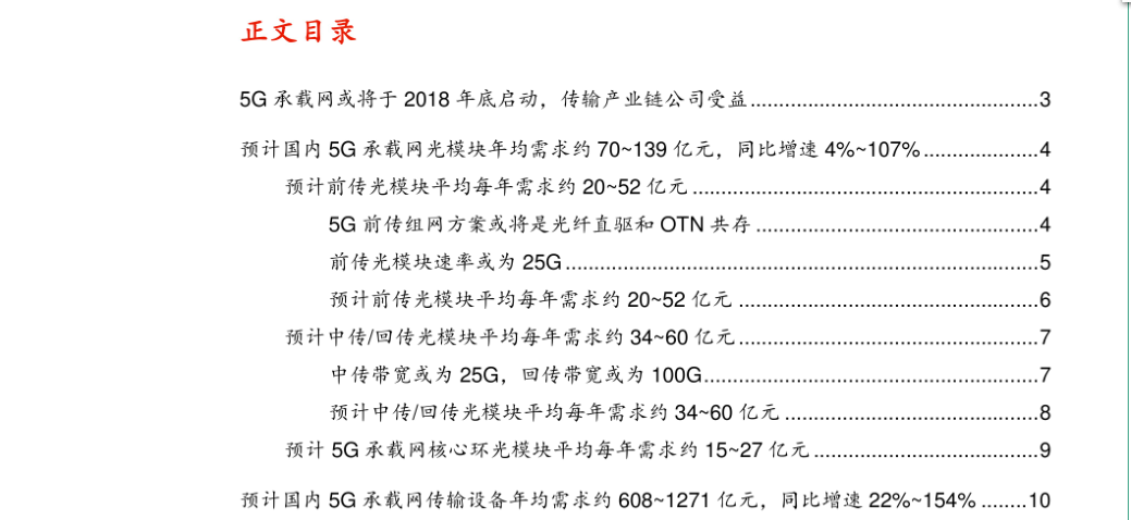 深度量化分析5G承载网传输设备及光模块市场空间,解析受益标的。市场对5G承载网建设仅停留在定性认识的层面上,缺乏具体的量化分析。本报告根据未来5G承载网技术演进方向,从量化角度解析未来5G光模块及传输设备市场空间,并剖析相关领域的受益企业。