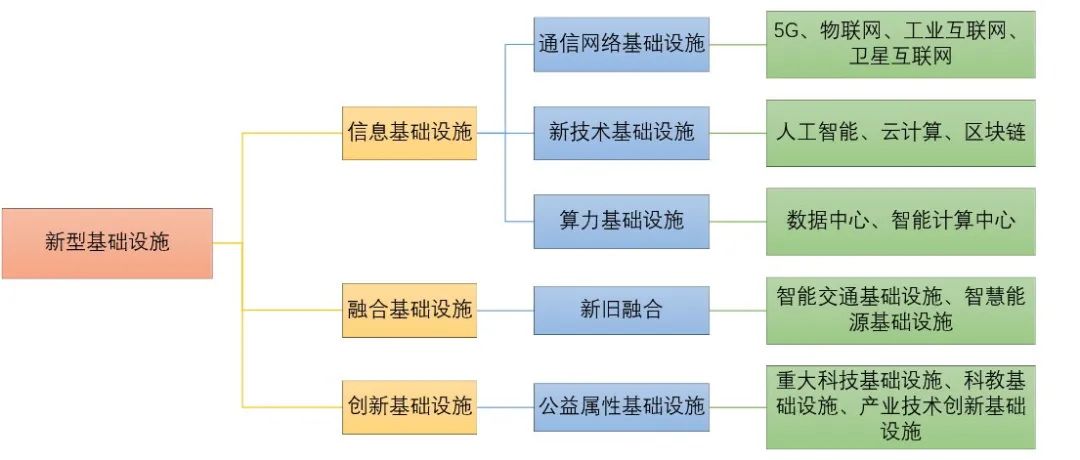信息基础设施。主要是指基于新一代信息技术演化生成的基础设施。比如,以5G、物联网、工业互联网、卫星互联网为代表的通信网络基础设施,以人工智能、云计算、区块链等为代表的新技术基础设施,以数据中心、智能计算中心为代表的算力基础设施等。