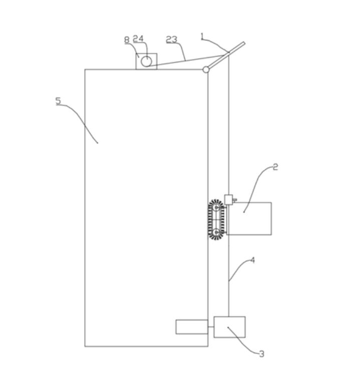 本发明公开了一种楼宇自动清扫机器人,包括主箱体,主箱体前部加装有前置壳体,前置壳体上安装有多个距离感应器,下部开设有两个相同规格的清扫口;主箱体上加装有顶盖,顶盖上设有柱形的喷雾盒,喷雾盒上部一圈等距设有多个气缸一。本发明与现有技术相比的优点在于:整体结构简单实用,集成了自动拖扫一体、自主乘坐电梯、尘袋自动收集、布自动清洁、远程操控与故障报警、缺电自动回充、自动避障、清扫范围规划和自动语音播报功能,大大降低了人力投入,提高了清扫的智能化和自动化程度,使用和后期维护便捷,极大提升了清扫效率和质量,便于推广。