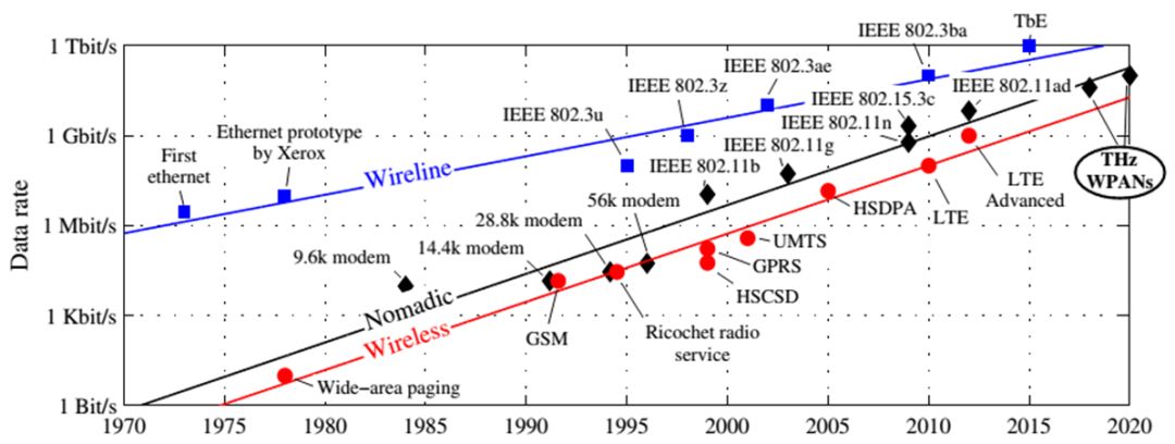 在过去的几十年里,无线数据传输速率每18个月翻一番,以满足数据流量的爆炸性增长。图1为根据Edholm定律预测的无线通信系统的数据传输速率曲线图。根据此图可以看出,到2020年前后,无线通信系统的数据传输速率接近100 Gbit/s。在原有的无线高速通信技术上,如何进一步地提高无线网络速率是现阶段无线通信领域的一个重要的研究方向。人们设想在不久的将来将需要每秒太比特(Tbps)的链路。不幸的是,传统无线通信系统(5 GH以下)甚至最近研究的毫米波通信解决方案(30-300GHz)也无法实现如此高的数据速率。这激发了更高频段的探索和相应的通信解决方案。在这种情况下,太赫兹(THz)频段(0.1-10 THz)已经被提升为一个关键的无线技术来满足这个要求。太赫兹超高速无线网络是一种新型的无线网络,与传统的无线网络不同,它工作在太赫兹频段,并且可支持数10Gbps乃至1Tbps的数据传输速率。太赫兹频段的频段较宽,且大部分尚未被分配使用,能够承载Gbps的数据量,具有广泛的应用前景;利用太赫兹频带进行通信能够有效缓解日益紧张的频谱资源和当前无线系统的容量限制。