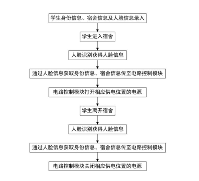 本发明提供了一种基于人脸识别的智能控电方法,首先在人脸及学生信息库中录入各个宿舍对应的学生信息,当学生进出宿舍大厅时,通过人脸识别装置以及电路控制装置进行楼宇内电路的控制,当学生进入宿舍大厅时,人脸识别装置识别出该学生的信息,电路控制模块打开该学生宿舍内对应电源的开关,当学生离开宿舍大厅时,人脸识别装置识别出该学生的信息,电路控制模块关闭对应开关。本发明可以解决校园宿舍区学生用电安全的问题,准确的确定学生所需的供电位置,以及在学生离开宿舍时及时切断电源从而保证宿舍无人时的电路安全管理。
