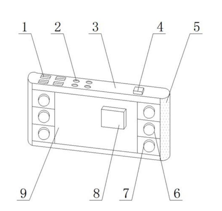 本实用新型公开了一种智能办公楼宇的中控装置,包括外壳体和上梁,所述外壳体的上表面左端设置有USB接口,所述USB接口的右侧设置有音频接口,所述外壳体的右端设置有散热板,所述散热板的左侧设置有收缩按钮,所述收缩按钮的下方设置有调光按钮,所述外壳体内设置有信号发射机,所述外壳体的内部前表面中间位置处设置有显示屏,取消传统百叶窗拉绳式结构,在百叶窗上设置有信号接收机,信号接收机通过信号传输,控制马达控制百叶窗进行运作,实现百叶片的升降及叶片的收折遮蔽或展开透光,操作简单灵活,一键完成,无需使用者亲自进行收折,不仅节省了使用者时间,还增加了中控装置的功能性。