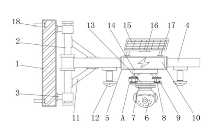本实用新型公开了一种智能楼宇监控设备,包括安装板,所述安装板的一侧表面均设有固定块,且固定块上安装有固定杆。有益效果:本实用新型通过固定杆和支撑杆,能够有效提高支撑板的稳定性,即使在受到大风天气时,也不易受强风影响而导致监控摄像头的视角发生改变,有利于提高监控设备的稳定性,照明灯在夜晚为行人提供照明的同时,还可以为监控设备提供足够的灯光,使监控设备更加清晰的进行监控,有利于提高监控质量,通过顺时针转动连接块,促使卡块与卡槽紧固卡接,便于对监控摄像头进行安装,当后期需要对监控摄像头进行检修或保养时,直接通过逆时针转动连接块,促使卡块与卡槽分离,便于拆卸监控摄像头进行检修或保养。