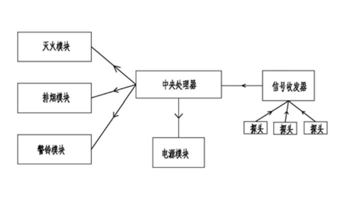 一种智能高校楼宇消防安全及应急系统,属于高校消防技术领域,包括中央处理器、信号收发器、探头、电源模块、灭火模块、排烟模块、警铃模块,其特征在于:所述信号收发器输入信号端连接有探头,所述信号收发器输出信号端连接有中央处理器,所述中央处理器一号输出信号端连接有电源模块,所述中央处理器二号输出信号端连接有灭火模块,所述中央处理器三号输出信号端连接有排烟模块,所述中央处理器四号输出信号端连接有警铃模块,工作人员可以将探头放置在教室不同高的的墙体上,并且在火灾发生时可以在第一时间将电源进行断电。