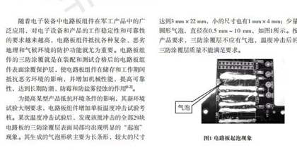 随着电子装备中电路板组件在军工产品中的广 为瑟高某型产品抵抗环境条件的影响,其新环境试验大纲要求,电路板组件增加单板温度冲击试验考核。某次温度冲击试验后,发现该批冲击的全部29块电路板的三防涂覆层表面局部均出现明显的“起泡”现象。其生成的气泡形状主要为长条形,较大的尺寸