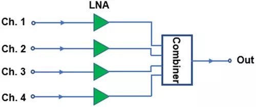 原来待测件是一个含有四个通道的接收模块,每个通道只含有一个LNA,然后经过合路器合为一路输出,如图1所示。按理说,逐一测试每一通道的噪声系数还是比较简单的,因为通道中没有变频器件。但是麻烦在于,四路LNA的供电是同一路,如果测试其中一路时,很难做到只给一路而不给其它三路供电。因此,为了方便测试,朋友问能否在四路同时供电的情况下测试每一路的噪声系数。如果这样测试,大体上会带来多大的误差?