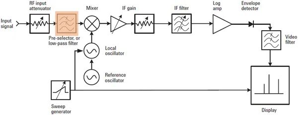 无论是采用模拟IF处理的传统频谱仪,还是采用数字IF处理的现代频谱仪,都是扫频式架构,通过第一级本振(LO)的调谐实现射频的扫频测试。熟悉频谱仪架构的朋友都了解,在第一级混频器之前都会存在一个预选器,如图1所示,这个预选器是个什么器件?具体有什么功能呢?