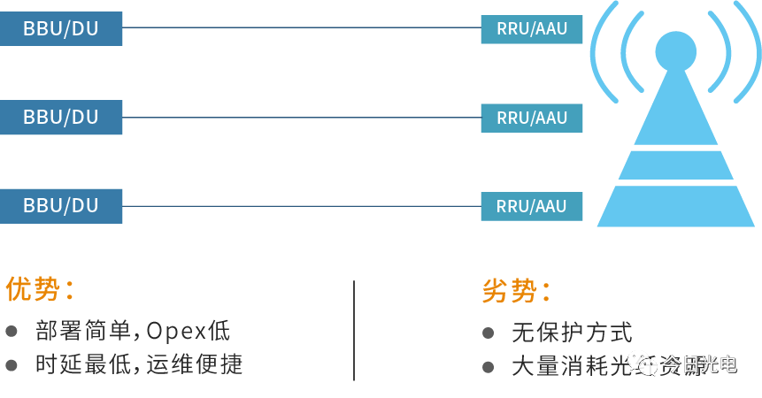 运营商前传方案的选择考虑的主要决定因素包括基站接入方案和传输综合成本等,其中传输综合成本有传输设备(含光模块)的成本、光纤光缆采购铺设维护成本等。5G前传对承载网的带宽和时延均提出了更为严苛的要求,目前优先使用25Gbps eCPRI接口,时延要求低于100μs。前传承载方案主要包括传统的光纤直驱方案、有源WDM/OTN方案、无源WDM方案和半有源WDM方案。