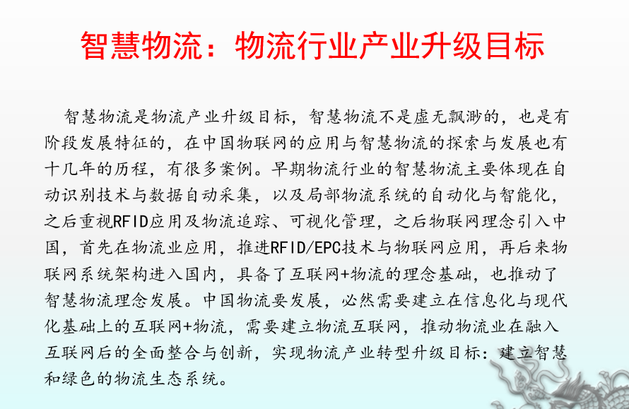 智慧物流是物流产业升级目标,智慧物流不是虚无飘渺的,也是有阶段发展特征的,在中国物联网的应用与智慧物流的探索与发展也有十几年的历程,有很多案例。早期物流行业的智慧物流主要体现在自动识别技术与数据自动采集,以及局部物流系统的自动化与智能化,之后重视RFID应用及物流追踪、可视化管理,之后物联网理念引入中国,首先在物流业应用,推进RFID/EPC技术与物联网应用,再后来物联网系统架构进入国内,具备了互联网+物流的理念基础,也推动了智慧物流理念发展。中国物流要发展,必然需要建立在信息化与现代化基础上的互联网+物流,需要建立物流互联网,推动物流业在融入互联网后的全面整合与创新,实现物流产业转型升级目标:建立智慧和绿色的物流生态系统。