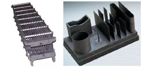 采用冷等静压CIP(ColdIsostatic Pressing)工艺生产的各向同性石墨具有高强度、低消耗、结构细密和理化特性均匀等特性,与天然石墨相比,其颗粒没有择优取向,强度和导电各向等性、组织均匀颗粒微细致密强度高,其应用实例见图1,应用领域包括:①可承受超过1000℃(1800℉)的高温和高腐蚀环境的DSS(定向凝固)或VGF(垂直梯度凝固)工艺多晶铸锭炉配套热场(细颗粒石墨制成加热器、底板和侧板部件);②太阳能高纯度单晶硅、锗和III/V族化合物单晶直拉单晶制造(CZ法)装置(包括加热器、三瓣坩埚、炉底护盘等石墨材质零配件);③硅电池片生产过程:镀抗反射涂层膜等离子气相沉积(PECVD)耐高温、高强度、导热性好载体石墨舟和模具电火花放电加工EDM(Electron Discharge Machining)电极;④航空航天、陶瓷、冶金、热处理高温炉、机械密封用玻璃及石英工业和核工业、有色及贵金属工业等领域,并逐渐由一般产业机械领域扩展到电气、电子学、尖端技术、运输机械、高新科技领域,主要用途见图1。