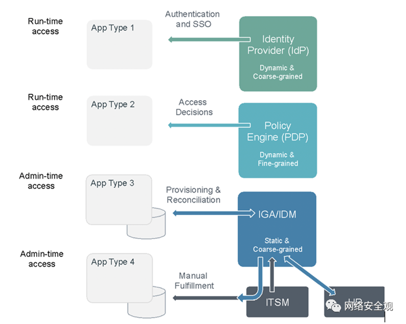 IAM的构建模块可以分为三类:身份、认证、授权。现有技术主要集中在前两个方面,即身份生命周期管理和身份认证。而授权通常由开发人员和应用程序所有者负责。所导致的结果是没有真正的控制,也缺乏对用户可以做什么或看什么的可见性。