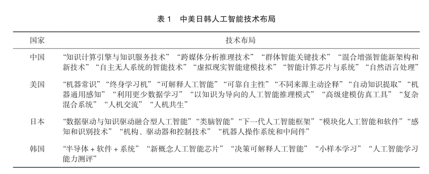 本文梳理回顾了人工智能历史上存在的三种技术路线——符号主义人工智能、联结主义人工智能、行为主义人工智能的发展现状,并探讨了世界主要国家在人工智能领域的布局,通过对比中、美、日、韩四国在人工智能领域发布的战略性政策文件,分析了四国在人工智能领域技术布局的异同,并着重分析了四国共同关注的知识驱动、类脑智能、可解释性三大技术,同时对我国人工智能发展提出了对策建议。
