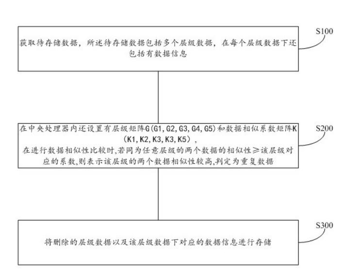 本发明涉及一种基于数据筛选的数据存储方法,该方法包括获取待存储数据,待存储数据包括多个层级数据,在每个层级数据下还包括有数据信息;在中央处理器内还设置有层级矩阵G(G1,G2,G3,G4,G5)和数据相似系数矩阵K(K1,K2,K3,K3,K5),在进行数据相似性比较时,若同为任意层级的两个数据的相似性大于等于该层级对应的系数,则表示该层级的两个数据相似性较高,判定为重复数据;否则不进行数据筛选,将筛选的层级数据以及该层级数据下对应的数据信息进行存储,作为当前数据层级的异地备份数据。通过对存储的数据按照特定的格式进行划分,并且对每个层级设置不同的相似系数,便于对数据的相似性进行准确的判断,要采用相似性系数较高的参数,提高数据比较的准确性。