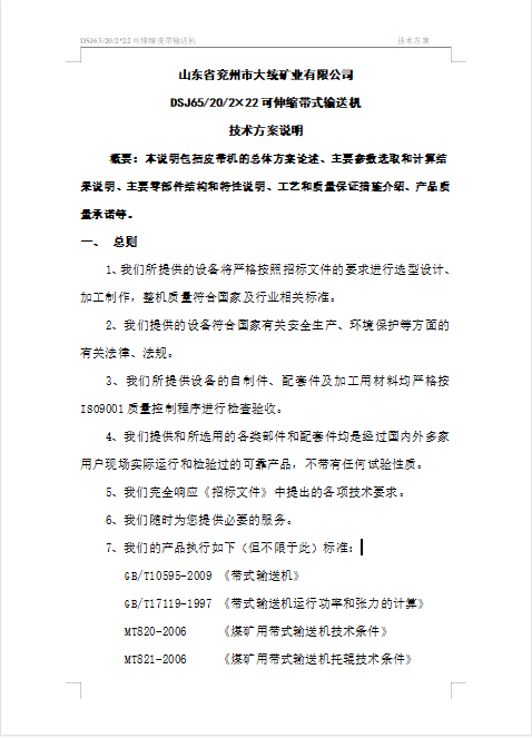 本说明包括皮带机的总体方案论述、主要参数选取和计算结果说明、主要零部件结构和特性说明、工艺和质量保证措施介绍、产品质量承诺等。