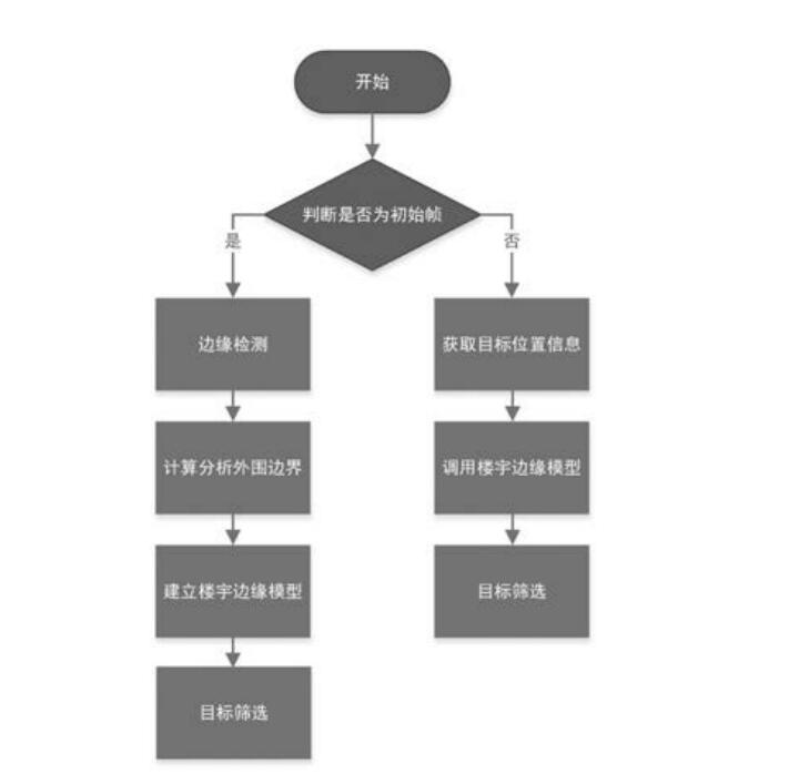 本发明涉及一种外围边界建模方法、智能监控方法及装置。本发明的技术方案是:该建模方法:对图像做边缘检测,得到二值化的边缘检测结果;对边缘检测结果的二值化图像进行膨胀操作;遍历经膨胀的二值化图像中的点,以P(x,y)表示图像中的点(x,y)的像素值,若在同一x下满足以下条件 P(x,y)=255则记录当前坐标(x,y),作为边界点,结束当前循环,同时继续判断下一个点x+1对应的y值是否符合上述条件;若相邻x位置存在边界点,而当前x位置不存在边界点,则当前x位置获取前一位置得到的边缘信息;将记录的的数据(x,y)对应写入map映射表中,其中x为key值,y为对应的value值,完成对外围边界建模。本发明适用于楼宇智能监控领域。