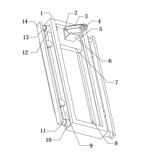 本实用新型公开了一种医院楼宇电梯智能安防装置,包括固定框和摄像头,所述固定框的两侧外壁均开有滑槽,且两个滑槽的内壁均滑动连接有滑筒,两个滑筒的内壁均插接有插杆,两个插杆的另一端均固定连接有调节板,两个所述调节板靠近底端的外壁均固定连接有连接柱,且固定框靠近连接柱的两侧外壁均固定连接有连接筒,连接柱插接于连接筒,滑筒的长度大于连接筒的长度。本实用新型通过设置有连接筒、连接柱、滑筒和插杆,进行摄像头的拆卸或者维修时,将滑筒从滑槽的内壁滑下,从而将安装板下降,便于工作人员对摄像头进行拆卸或者维修,无需工作人员爬高,从而提高该安防装置拆卸或者维修的安全性。